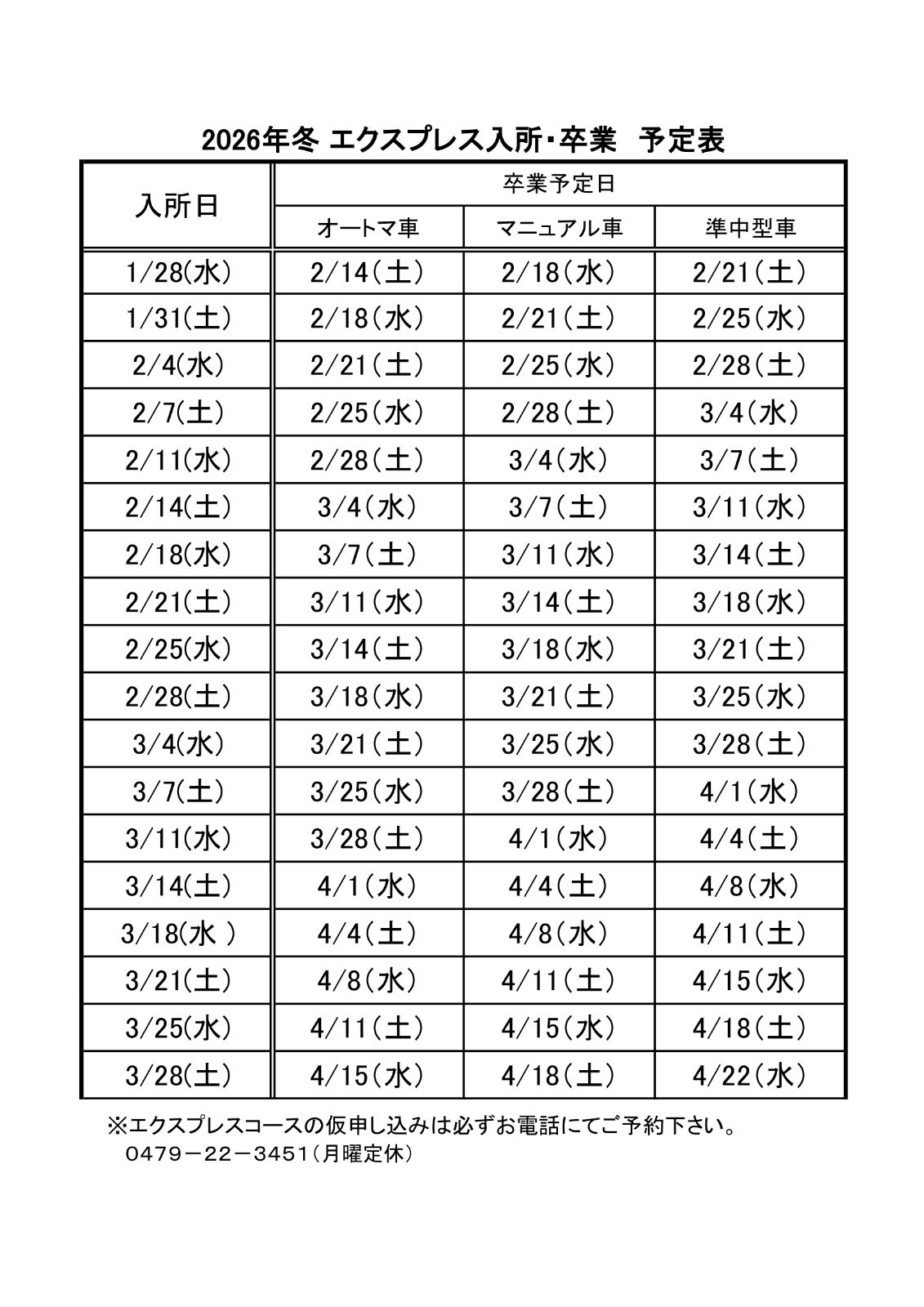 ◎エクスプレスコースの入卒予定は下記をご確認下さい。