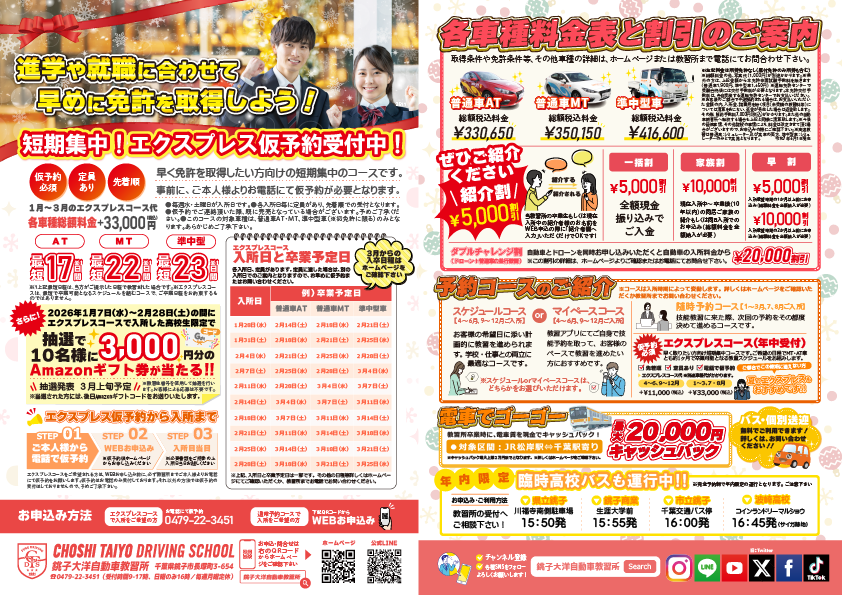 上記、期間内に教習開始、JRで教習所まで通学される学生限定