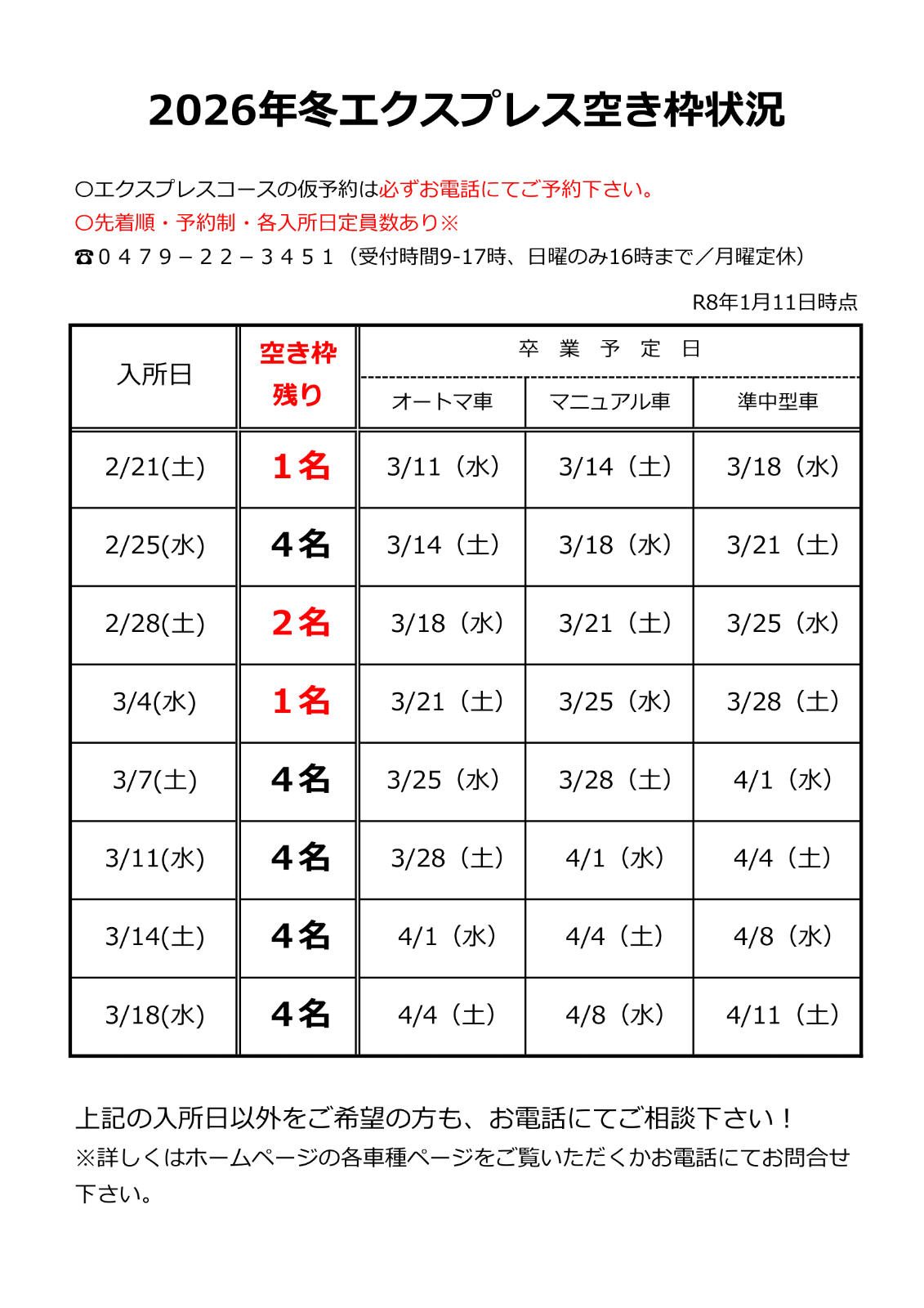 ◎エクスプレスコースの空き状況は、下記をご確認下さい。