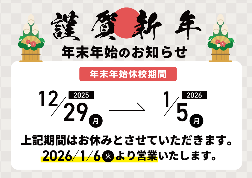 誠に勝手ながら下記期間、年末年始のため休校とさせていただきます。